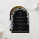 Um convite de casamento com arco floral de aquarela de flores silvestres elegantes que enquadra os detalhes da celebração do seu casamento em tipografia branca elegante em um fundo preto sofisticado. Com a sua foto especial no verso. Criado por Thisisnotme©