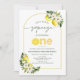Limões de Arca Moderna Nosso primeiro aniversario de Aperfeiçoamento Principal Convite para o primeiro aniversário de um limão doce, chamado limão doce, com dois limões e rosas brancas arranjos florais, arca de linha e palavra caligráfica moderna. Esse convite principal de primeiro aniversario de aperto também apresenta uma palavra decorativa que soletra uma com fatia de limão.
