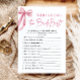 Teste o conhecimento dos seus convidados com o nosso jogo de Chá de panela "Quem Conhece Melhor A Noiva". Com seu charmoso design cor-de-rosa, este jogo adiciona um toque de elegância à sua celebração enquanto os convidados competem para ver quem conhece melhor a noiva. Da trivialidade sobre suas coisas favoritas às memórias compartilhadas, este jogo certamente provocará risos e competição amigável entre amigos e família.