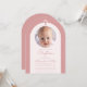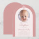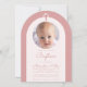 Um convite de batismo de menina moderno. Dentro de um arco rosa po, tem um arco rosa muito claro, quase branco, com uma foto circular e texto rosa po dentro. Acima da foto, h uma cruz rosa po. A ocasiao e o nome sao escritos em letra manuscrita.