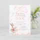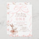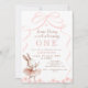 Arco Branca Rosa Alguns Aniversário Coelhinhos Convidam Meninas Doces coelhando o convite de aniversário que pode ser usado em qualquer idade com um arco rosa, coração e coelhinho fofo em um tutu. Este convite de aniversário coelho também apresenta margaridas cor-de-rosa e marrom.