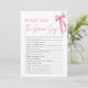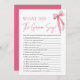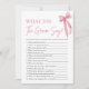 Descubra percepções hilárias com o nosso jogo de Chá de panela "O que o noivo disse". Com seu charmoso design cor-de-rosa, este jogo adiciona um toque de elegância à sua celebração enquanto os convidados adivinham as respostas do noivo a várias questões sobre a futura noiva. De sentimental a bobo, este jogo certamente despertará risos e criará memórias inesquecíveis enquanto os convidados tentam corresponder às respostas do noivo.