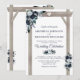 Convites de casamento azuis rústicos com um fundo branco trendy que pode ser alterado para qualquer cor, um arco de casamento de madeira rústica, flores em aquarela em pó azul boho chic, um coração esculpido com as iniciais do casal e um modelo de casamento moderno.