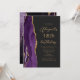 A borda esquerda deste elegante convite de aniversário moderno apresenta uma cor d'água roxa, borda agitada com brilho dourado. O texto personalizável combina o script dourado e as fontes sans serif em um fundo preto de slate. O verso apresenta um design de agate roxo e dourado correspondente.