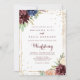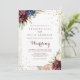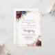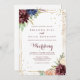 Este convite de casamento para a frente e para trás é perfeito para um casamento rústico. O design apresenta uma aquarela desenhada à mão, púrpura, marinho, pincel, burgundy, flores marinhos, folhas verdes e douradas que adornam uma elegante moldura geométrica. Salve o papel, incluindo mais detalhes na parte traseira do convite em vez de em uma placa de gabinete separada.