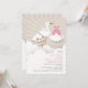 Um convite de chá de fraldas com uma ilustração de uma cegonha com um feixe cor-de-rosa, nuvens e rajadas de sol. Personalize o texto.
