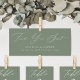Cabeçalho elegante de assentos de casamento com a frase "Find Your Seat" (Encontre seu assento) exibida em um moderno roteiro de caligrafia branca com um fundo verde sábio. Personalize o cartão de cabeçalho do gráfico de assentos verde de sábado com seus nomes, data do casamento e local do casamento. A design coordena-se com a nossa coleção de casamentos da Elegância Moderna.