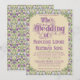 An elaborately detailed Art Nouveau wedding invitation featuring a pattern of lilac lovebirds and lavender butterflies in profile perched atop scrolling vines of purple thistle on a pale yellow background. A pairing of elegant fonts has been carefully selected to accompany this invitation's decorative floral announcement text, however, they can be changed to meet your needs. You can also change their colors, as well as the color of the announcement text.
