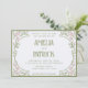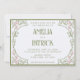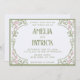 Art Nouveau style floral horizontal wedding invitation in green and pink on white background with blue undertone