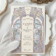 This two-sided wedding invitation features an elegant Art Nouveau frame filled with blooming magnolias, curling vines, and lily-of-the-valley motifs. Stylized whiplash curves sweep around a central ivory panel, creating a romantic architectural border reminiscent of Belle Époque posters and antique stained glass. Soft pastel tones of lilac, blush, blue, and celadon are outlined with fine, golden line work that gives the artwork a refined, heirloom quality.