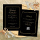 Linhas geométricas elegantes enquadram suas informações personalizadas de casamento em tipografia dourada sofisticada sobre um fundo preto. Com seus detalhes e código QR do site do casamento no verso. Desenhado por Thisisnotme©