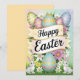 Esta imagem transmite um feliz e simples cumprimento de Páscoa. "Feliz Páscoa" está escrito em faixas decorativas em meio a um fundo pastel. Espalhados ao redor estão ovos coloridos, flores e um par de coelhinhos brancos, criando uma cena delicada e festiva.