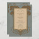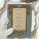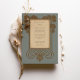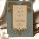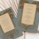 Anuncie seu casamento com eterno elegância usando este convite inspirado na Arte Deco. A design apresenta um painel central com os detalhes do convite, enquadrados por árvores estilizadas e intrincadas escrolhas em tons ricos de ouro e marrom, colocados contra um sofisticado fundo azul-cinza. As árvores lembram-se do período de deco da arte. O verso, para "Os detalhes mais finos", apresenta um layout complementar com a mesma árvore de na moda e elementos de rolagem que enquadram o texto. Esta suíte evoca uma sensação de glamour clássico e charme vintage. É ideal para casais que procuram um anúncio sofisticado, na moda e memorável para o seu casamento, perfeito para uma celebração formal ou de temas antigos.