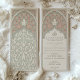 Este convite artístico combina a intrincada beleza do local islâmico com um coral e uma paleta de cores de sábio únicos, criando uma peça que é culturalmente rica e visualmente cativante. O padrão de rendas apresenta uma mistura harmoniosa de flores e formas geométricas, evocando as entalhes de ornamentado encontradas em mesquitas históricas. O coral acrescenta um toque caloroso e romântico, enquanto o sábio oferece um contraponto natural e calmo, juntos produzindo um olhar convidativo e elegante. Este convite é perfeito para o casal que deseja um casamento de tradição e modernidade e deseja fazer uma declaração com a papelaria do casamento.