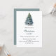 Um convite de inverno para uma festa de Natal. Um fundo branco na frente decorado com um pinheiro desenhado à mão, de cor aquosa, com neve. Personalize e adicione os detalhes da sua festa. Fundo: fundo azul-verde.