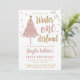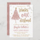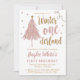 Celebre o seu primeiro aniversario com estes convites para os temas da Terra da Onederland de inverno, sempre fofos! Este design colorido apresenta uma árvore de Natal ao estilo de vassoura pintada à mão na sombra rosa com luzes de Natal.