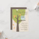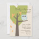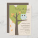 As corujas temem convites para bebês, de red_dress, com uma coruja de desenho animado sentada em um galho marrom, árvore verde em forma de coração e folhas laranja, impressas em um fundo bege/névoa. A ilustração fofinha da coruja apresenta tons de olhos azuis e grandes, excelente de um chá de fraldas de menino.
