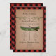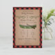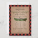 Um convite do casamento que caracteriza uma ilustração de dois ramos de árvore verdes e de uma canoa verde. O fundo é xadrez vermelha e preta. Personalize o texto.