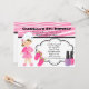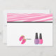 Comece a comemorar bem com este convite de estribo de zebra branca e rosa para a moda. Há uma garota adorável em um roupão rosa com chinelos correspondentes. O cabelo dela está embrulhado numa toalha. Há um centro em forma de bolha branca com um caimento de linha preta e um caimento pontilhado. Há duas garrafas de esmalte na parte inferior deste convite. Ao lado da garota bonitinha há um par de chinelos rosa-quente com arcos verdes limões. É perfeito para a festa de aniversário daquela garota que adora ser mimada! Um dia no spa ou uma festa em casa. Veja os muitos outros produtos e designs nesta linha. © Ilustrações JW