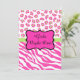 Celebrar com uma Noite das Raparigas com um convite cor-de-rosa. A design apresenta listras de zebra brancas e rosa-quente fuchsia e pintas de leopardo ou de chita combinadas para uma design moderna. Um emblema rosa-quente esboçado em preto senta-se num bar verde limão e cria uma área de personalização para um nome e palavras "Girl's Night Out" que podem ser personalizadas para outras palavras. O verso do convite inclui campos para todas as suas informações para o seu evento. Você pode facilmente alterar e excluir campos conforme necessário. As cores são brancas, cor-de-rosa fúcsia, pretas e verdes limões. As peles de animais selvagens para design gráfico são uma das tendências mais quentes de arte e design, e são extremamente populares de moda a decoração doméstica. Essa coleção sofisticada de zebra e impressão leopardo é uma das várias combinações de cores disponíveis para sua escolha de convites. Totalmente personalizável para personalizar.