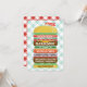 Convite de festas muito bonito do bebê Q com um Hamburger empilhado, as cebolas, a salmoura, a alface, o cachorro quente, o queijo, a mostarda, a ketchup, um fundo e a bandeira do teste padrão do piquenique do guingão que lê o "bolo no forno!" Seu convidado amará este convite original do chá de fraldas dos casais. Personalize com seu próprio texto. Verifique por favor minha loja para ver se há mais como esta. Ilustração original pelo pj_design. Envie-me por correio electrónico se você precisa a ajuda. Você pode fazer a isto um cartão maior personalizando o e clicando nas opções de papel.