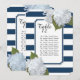 Esses cartões de assinalamento de mesa podem ser usados em cada mesa ou na entrada do seu evento. Esses cartões de número de mesa podem ser emoldurados, colocados em um suporte ou usados de várias maneiras para direcionar seus convidados para suas mesas no seu casamento formal, chá de noiva ou evento empresarial formal. Basta alterar o número da mesa e a lista de convidados para cada um e colocá-lo no seu carrinho de compras. Mostrado aqui com capacidade para 10 pessoas por mesa, você pode ajustar a lista às suas necessidades e simplesmente arrastá-la e centralizá-la quando terminar, usando o recurso "personalizar". Este design tem um desenho floral pintado à mão com flores de hortênsia azul suave. Um fundo listrado ousado em azul marinho e branco é combinado com uma moldura estilo art déco com cantos chanfrados, delineada com um brilho prateado falso. Direitos autorais da arte e design gráfico, Audrey Jeanne Roberts, todos os direitos reservados