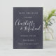 Apresentando nomes de estilo de assinatura, este quadro elegante salvo o cartão de data pode ser personalizado com as suas informações especiais sobre o dia do casamento em caracteres brancos. Projetado por Thisnotme©