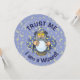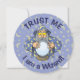 Um velho feiticeiro com capa azul olhando para a bola mágica de cristal.