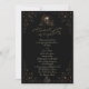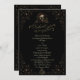 Este convite de casamento gótico elegante é projetado por um artista para o casal que aprecia um estilo sombrio, vitoriano e elegante. Ele apresenta intricados arabescos ornamentais em torno das bordas e um buquê de caveira no centro, bem como folhas de esqueleto.