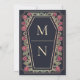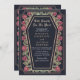 Faça uma declaração ousada de amor eterno. Este convite de casamento gótico apresenta "Até a morte nos separe" em um quadro em forma de caixão, enfeitado com espinhos, rosa e sotaques de ouro rosa contra fundo azul profundo. Perfeito para uma comemoração romântica assombrosa! Personalize o texto, a fonte e a cor de fundo para se adequar às suas preferências de design. Correspondência de Itens em nosso compro para um tema completo de festa. Note que o ouro de rosa do convite NÃO é folha de alumínio real e é impresso em cores planas.