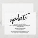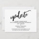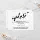 A distinção deste conjunto se deve à fonte moderna de escrita manual usada para as frases de destaque. No caso de você precisar informar aos seus convidados que o seu casamento foi cancelado, este cartão oferece uma opção ousada e atraente. Nesta peça, a fonte manuscrita foi usada para criar um gráfico simples que representa a palavra "atualização". Use os campos do modelo para adicionar seus detalhes pessoais e tornar este design moderno e único seu. O fundo branco pode ser alterado para qualquer cor que você preferir. Por favor, entre em contato para qualquer solicitação especial ou para obter ajuda na personalização. // 100 //