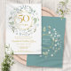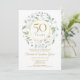 Uma grinalda decorativa de louro verdejante circunda uma borda de folha de ouro falso contendo o texto de aniversário de 50 anos. Abaixo, os detalhes do seu evento de aniversário são apresentados em texto clássico elegante. O verso apresenta os nomes do casal dentro de uma grinalda floral e de folha de ouro falso correspondente. Criado por Thisisnotme©