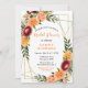 This fun and whimsical bridal shower invitation features watercolor burgundy red and orange flowers with foliage on a gold geometric frame. The text combines handwritten script and serif fonts for a stylish and modern look. This is perfect for an autumn fall rustic bridal shower.