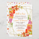 This fun and whimsical baby shower invitation features watercolor pomegranate, apples, grapes, mushrooms and foliage on a gold geometric frame. The text combines handwritten script and serif fonts for a stylish and modern look. This is perfect for a rustic autumn fall baby shower.