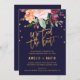 Neste floral de outono, nós amarramos o cartão de recepção de elopemento de nó é perfeito para uma festa de elopemento poste de outono. O design apresenta um buquê espantoso de pincel, pêssego laranja, e flores marsala burgundy com falsa tipografia de folha de ouro e confete. O apoio apresenta um arranjo floral coordenado com uma magnífica tipografia de casamento. As placas RSVP são vendidas separadamente. Nota: Este design não apresenta folha de ouro real. É um gráfico de alta qualidade feito para se parecer com folhas de ouro.