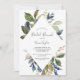 Este convite para brunch verde de outono é perfeito para um chá casamento outono. A design moderna rústica apresenta folhas azuis marinhos, verdes-sábios e douradas com espirros de flores azuis escuras.