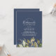 Este convite para o almoço das donas de marinho verde deste outono é perfeito para um evento de outono. A design moderna rústica apresenta folhas azuis marinhos, verdes-sábios e douradas com espirros de flores azuis escuras.