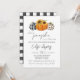 Um pouco de abóbora está a caminho! Celebrar a futura mãe com um convite de chá de fraldas do tema do outono. Três abóboras bonitinhas em gingham preto e branco e letras leopardo adicionam um pouco de encanto esquisito e rústico ao convite. Girassóis adoram a abóbora laranja central. A parte traseira apresenta um impressão preto e branco de xadrez. Todos os detalhes podem ser personalizados. Este é o convite perfeito para o chá de fraldas de outono, neutro em termos de gênero.