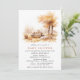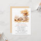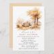 Convites de chá de bebê com tema a outono, com cenas de aquarela de uma mesa de piquenique sob folhas de queda laranja. Design de inspiração rustica com sotaques formais de guião. O texto do evento pode ser alterado. (O texto do script não é editável.) O lado inverso é uma cor bege quente. (As cores podem ser alteradas, se desejado, usando a ferramenta design).