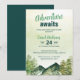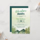 Um charmoso design em aquarela com montanhas, pinheiros e um toque rústico, perfeito para uma festa de bebê com tema florestal para menino. "aventura espera" Personalize facilmente com os detalhes da sua festa.