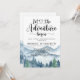 Convite de festa de aposentadoria com tema de água-forte 'Que a aventura comece' com paisagem de floresta e montanhas selvagens com tipografia de caligrafia. Um tema de aventura florestal rústica.
