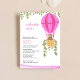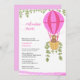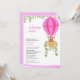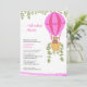 o design mostra um belo convite para chás de fraldas em tipografia e caligrafia rosa e preta do lado esquerdo e um balão de ar quente com ursinho bebê e muitos eucaliptos ligados a ele do lado direito. o design é bonito e bonito e será perfeito para o seu chá de fraldas.