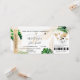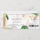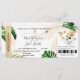 Bilhete de Passagem de Embarque de Praia de Destino Convite para Avião Dourado com ícone de coração e de avião com folhas tropicais