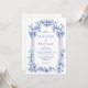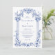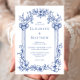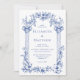 Este convite de casamento inspirado em vintage apresenta uma fronteira de colunas clássicas e motivos florais em azul sobre fundo branco. Os nomes do casal aparecem na fonte serif clássica, com o texto restante em itálico.