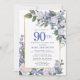 Honra uma mulher especial com este Convite de aniversário elegante e feminina. 90 é escrito em texto azul grande. A comemoração de aniversário segue. O nome do convidado também está em letras azuis. O resto do texto é cinza de pomba mole. Os detalhes da comemoração de aniversário são cercados por uma moldura de ouro chico que é decorada com rosas brancas e flores azuis. Os elementos florais estão aninhados em folhas verdes profundas. Enquanto é um design tradicional, a folhagem botânica aberta e arejada e o texto lhe dão uma vibração contemporânea. O convite de volta é um pouco azul profundo.