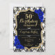 Elegante convite floral feminino de 50 anos com sua foto no final do cartão. Design azul real branco preto-claro com ouro brilhante. Apresenta cor damasco preta e branca, rosas azuis de safira, fonte de script e confetti. Perfeito para uma festa de comemoração de na moda adulto. Personalize com seus próprios detalhes. Pode ser personalizado para qualquer idade! Impressos convites Zazzle ou modelo de impressão digital instantânea para download.