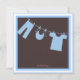 Um convite de chá maravilhosamente elegante apresenta uma linha de roupas doce em azul-bebê - sobre um fundo de chocolate escuro marrom - perfeito para a futura mãe que está esperando um garoto.