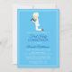 Convide amigos e família para celebrar a Primeira Comunhão dos seus filhos com este convite que inclui um rapaz louro num fato de comunhão branco que segura um rosário num fundo azul-macio. A parte traseira apresenta fundo azul suave e quadro branco duplo com cruz azul, pombos e faixa branca com o texto "Minha primeira comunhão". É fácil personalizar com opções personalizadas. Use o botão "Personalizar" para personalizar o produto ou adicionar texto.