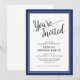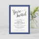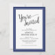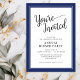 Este convite de festas de janto corporativo moderno apresenta texto elegante e é acentuado com uma borda azul escura. Este convite pode ser adaptado a qualquer evento de empresa.