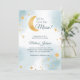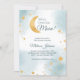 Um doce chá de fraldas com o tema do chá de fraldas "Estamos Sobre a Lua". Este convite tem uma lua brilhante de ouro falso com estrelas correspondentes a um fundo azul e branco de cor d'água.